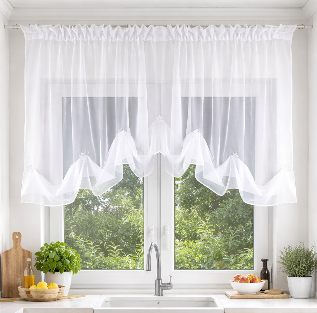 Firanka kuchenna z białego woalu to prosty sposób na odświeżenie wnętrza i nadanie mu lekkości oraz elegancji bez żadnego remontu. Delikatna tkanina pięknie rozprasza światło, dzięki czemu kuchnia staje się jaśniejsza, bardziej przytulna i optycznie większa.