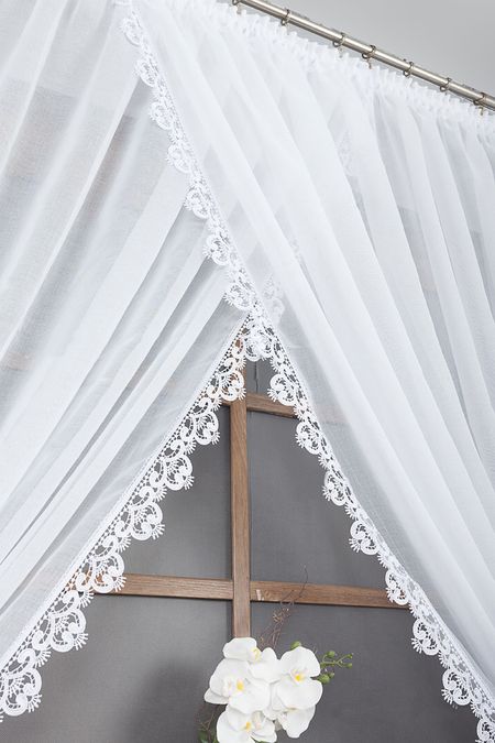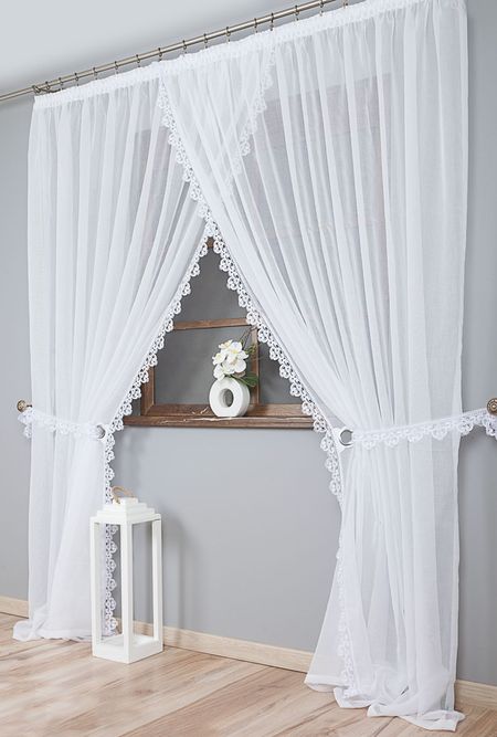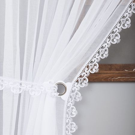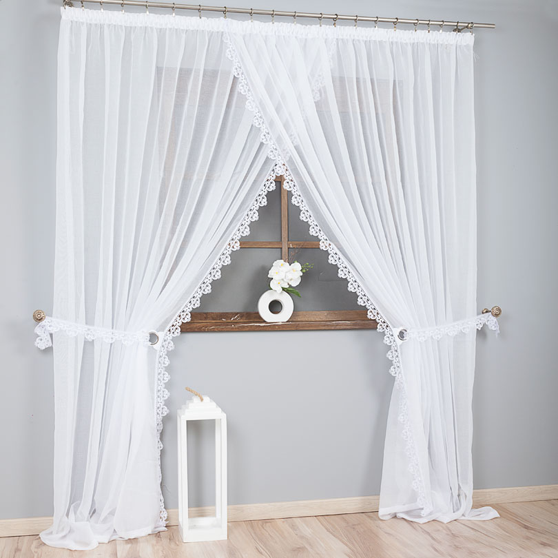 Bok od wewnątrz firanki zdobi elegancka gipiura o szerokości 8 cm, która nadaje całości dekoracyjnego charakteru i podkreśla klasyczny styl produktu. W zestawie znajdują się także praktyczne wiązania do upięcia firanki na boki, dzięki czemu można łatwo regulować ilość światła wpadającego do pomieszczenia oraz tworzyć efektowne aranżacje okienne.